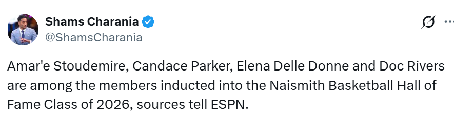 北京时间4月1日,名记Shams报道,消息人士向ESPN透露,道格-里弗斯、阿玛雷-斯塔德迈尔、坎迪斯-帕克、埃琳娜-德勒-多恩均入选2026届奈史密斯篮球名人堂。